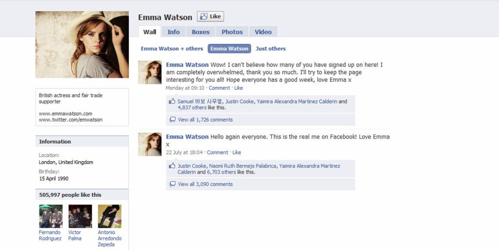 After launching her official twitter account, @EmWatson, Emma and the team at Great Fridays have now created a facebook account to go alongside it! The page includes a biography, messages and updates from Emma, as well as pictures and videos.
